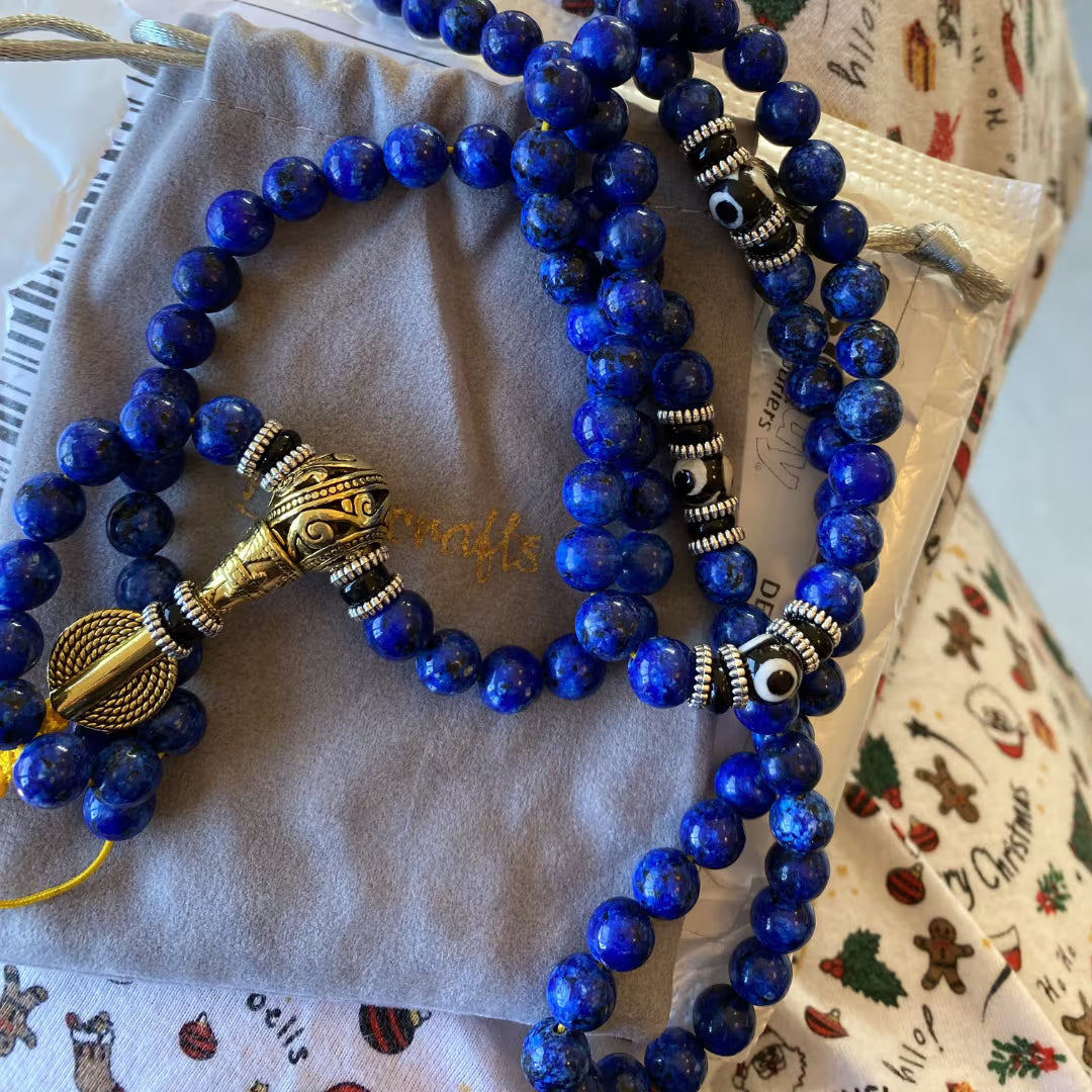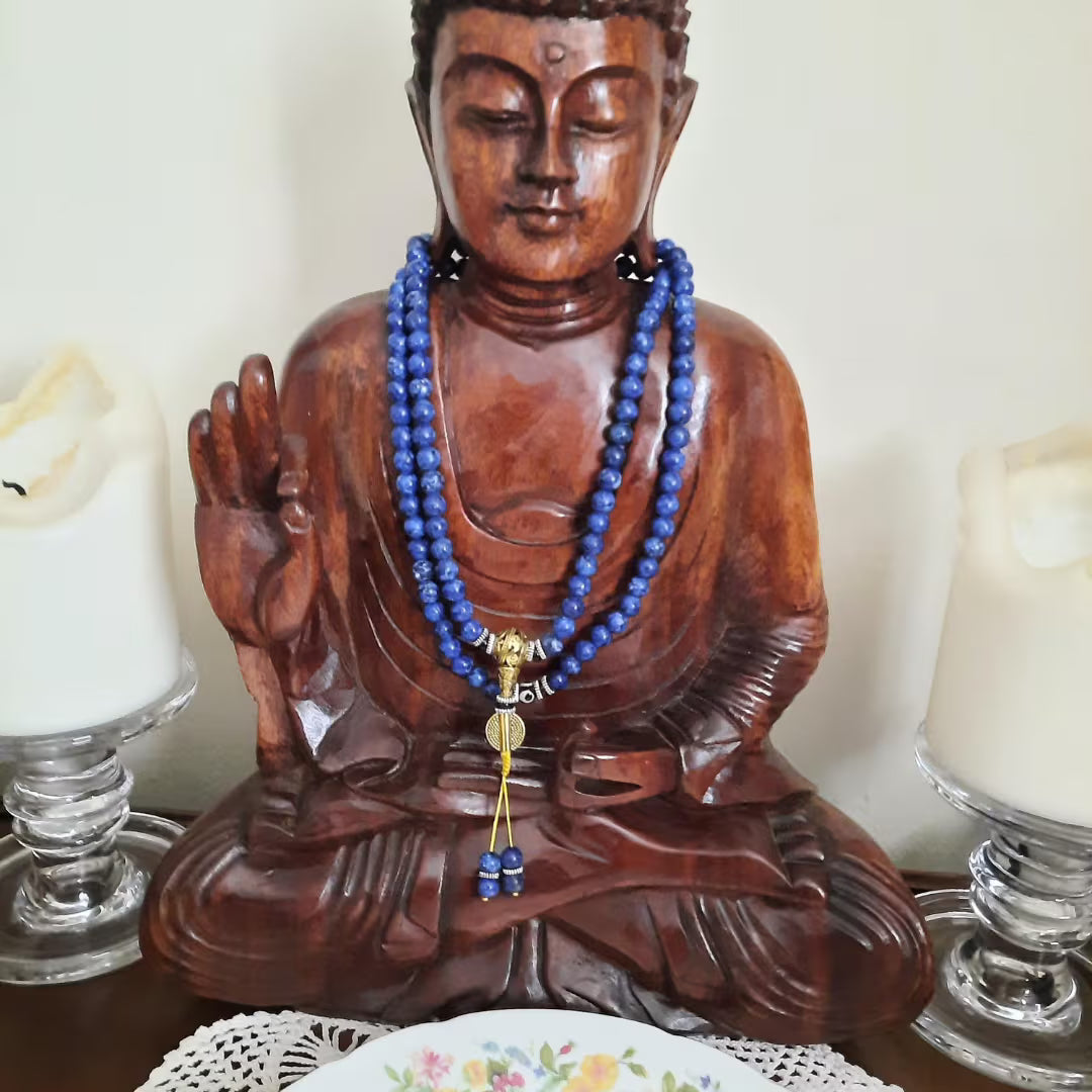 Chaque mala est fabriqué à la main à partir de lapis-lazuli pur et contient trois véritables perles Dzi, unissant ainsi la sagesse de l’Égypte ancienne aux traditions protectrices du monastère tibétain de Drepung.