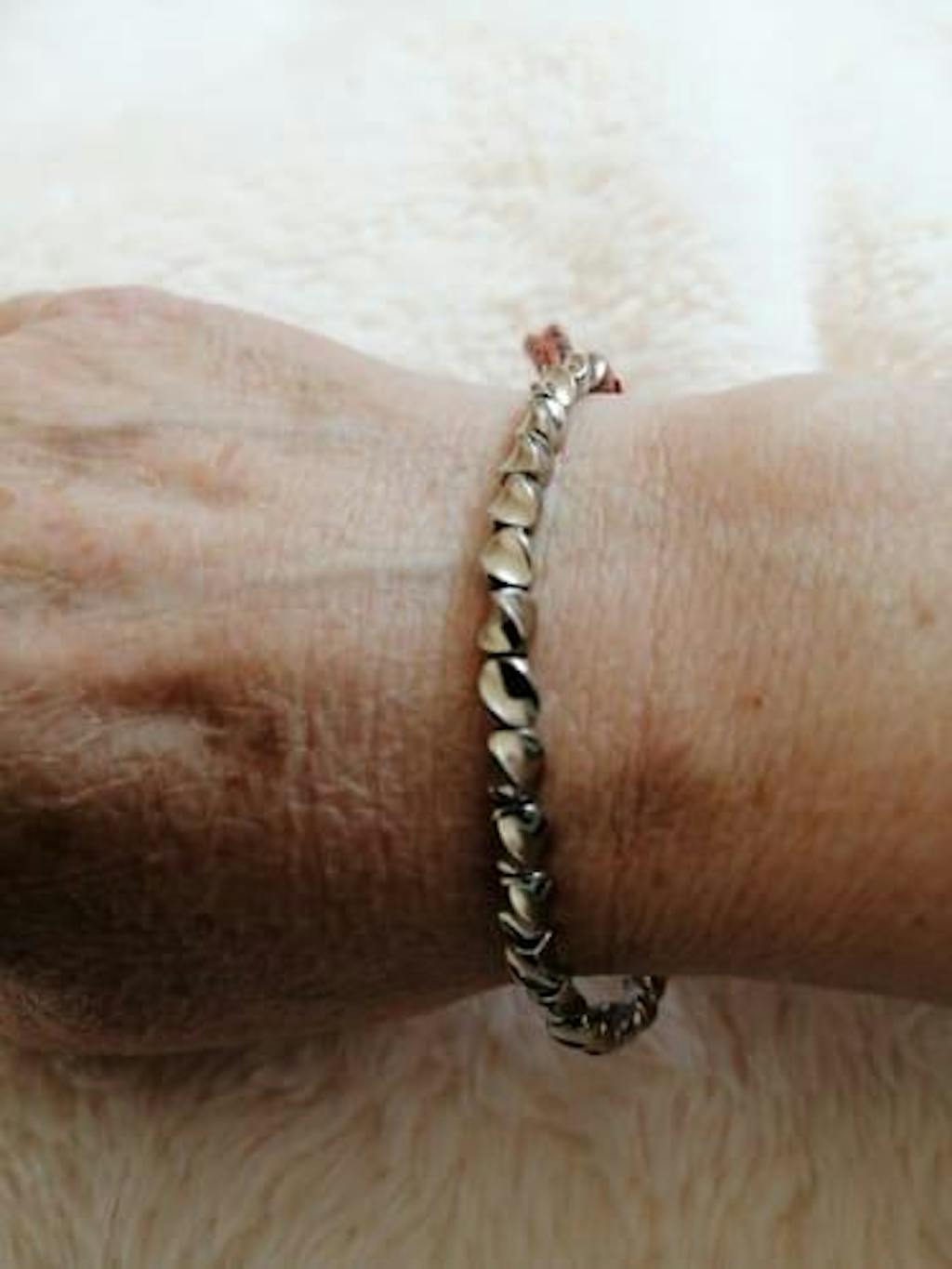 Pour être honnête, on ne sait jamais à quoi s'attendre lorsqu'on achète en ligne de nos jours. Je savais que cela serait une expérience spéciale, mais j'ai été ravie que cela se concrétise. Ce bracelet est superbe. Il est légèrement plus poli et brillant que ce qui semble être une finition matte dans les compétences de production, mais il est magnifique ! Je le porte tous les jours. Il est absolument simple à mettre et à enlever. Merci, merci, merci.