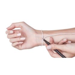La paume de votre main ouverte et tournée vers le haut, enroulez la ficelle ou la bande de papier autour de votre poignet, juste au-dessus de l'os du poignet. Marquez l'endroit où les extrémités se rejoignent avec un stylo ou un marqueur. Ensuite, posez la ficelle ou la bande de papier à plat et mesurez-la jusqu'à l'endroit où vous avez fait la marque pour trouver votre taille de poignet et notez-la.